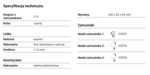 Opis produktu: ABM/2LB200 FLR to amortyzator bezpieczeństwa z regulowaną linką odporny na działanie czynników gorących i zatrzaśnikami AZ003, AZ024, AZ024. Jest produkowany przez polską firmę PROTEKT . Amortyzator ten spełnia normy EN 355 .