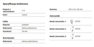- Amortyzator: Wykonanie – taśma poliamidowa, Wymiary – 200 x 32 x 45 mm