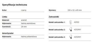 • Amortyzator: Wykonanie – taśma poliamidowa, Wymiary – 200 x 32 x 45 mm