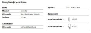 - Amortyzator: Wykonanie – taśma poliamidowa, Wymiary – 200 x 32 x 45 mm