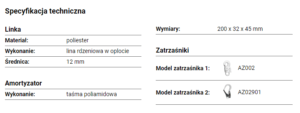 - Amortyzator: Wykonanie – taśma poliamidowa, Wymiary – 200 x 32 x 45 mm