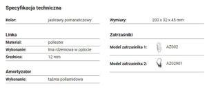 ABM/LB100HV to amortyzator bezpieczeństwa z linką regulowaną i zatrzaśnikami AZ002, AZ029, w kolorze jaskrawym pomarańczowym, wyprodukowany przez polską firmę Protekt.