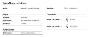 ABM/LB100HV to amortyzator bezpieczeństwa z linką regulowaną i zatrzaśnikami AZ003, AZ029, w kolorze jaskrawym pomarańczowym, wyprodukowany przez polską firmę Protekt.