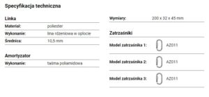 - Amortyzator: Wykonanie – taśma poliamidowa, Wymiary – 200 x 32 x 45 mm