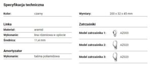 Amortyzator ten jest przeznaczony do pracy w trudnych warunkach i zapewnia bezpieczeństwo użytkownikowi. Posiada podwójną linkę elastyczną oraz zatrzaśniki AZ003, AZ023 i AZ023.