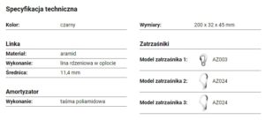 Amortyzator ten jest przeznaczony do pracy z szelkami i jest odporny na działanie czynników gorących. Posiada podwójną linkę elastyczną oraz jest zabezpieczony przed przypadkowym rozpięciem dzięki zatrzaśnikom AZ003, AZ024 oraz AZ024.