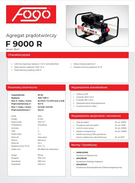 Agregat prądotwórczy FOGO F 9000 R – ok. 8,0 kW ciągłej / 8,8–9,0 kW maks., 230 V (AVR)