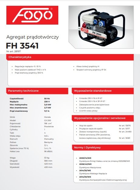Agregat prądotwórczy FOGO FH 3541 – 3,0 kW maks. / 2,7 kW ciągłej, 230 V (Honda, CVR)
