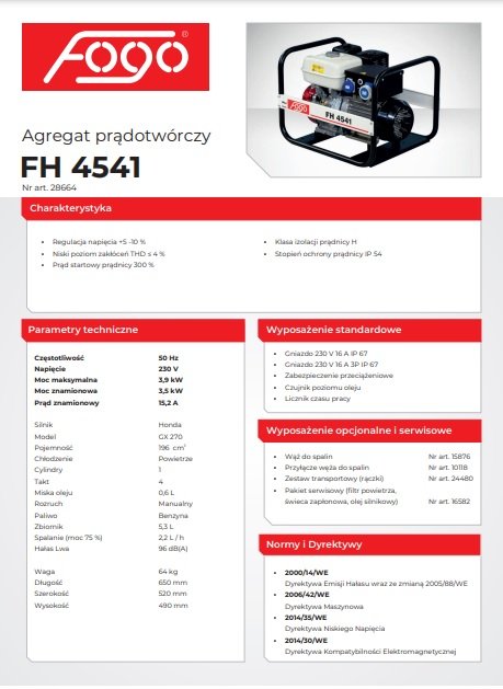 Agregat prądotwórczy FOGO FH 4541 – 3,5 kW ciągłej / 3,9 kW maks., 230 V (Honda, IP54)