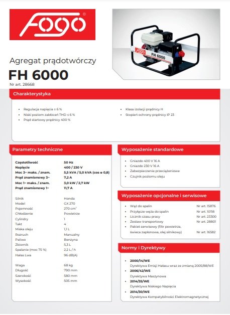 Agregat prądotwórczy FOGO FH 6000 – 5,6 kW ciągłej / 6,2 kW maks., 230 V (Honda, CVR)
