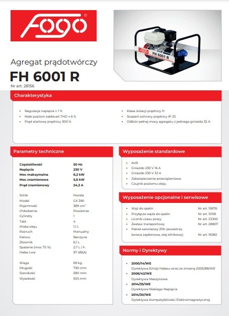 Agregat prądotwórczy FOGO FH 6001 R – 5,6 kW ciągłej / 6,2 kW maks., 230 V (AVR, Honda GX390)