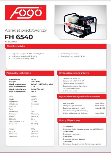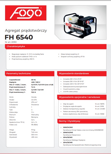 Agregat prądotwórczy FOGO FH 6540 – trójfazowy 400/230 V (Honda GX390, IP54)
