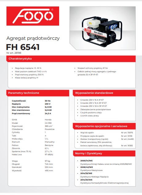 Agregat prądotwórczy FOGO FH 6541 – 5,2 kW ciągłej / 5,8 kW maks., 230 V (Honda, IP54)