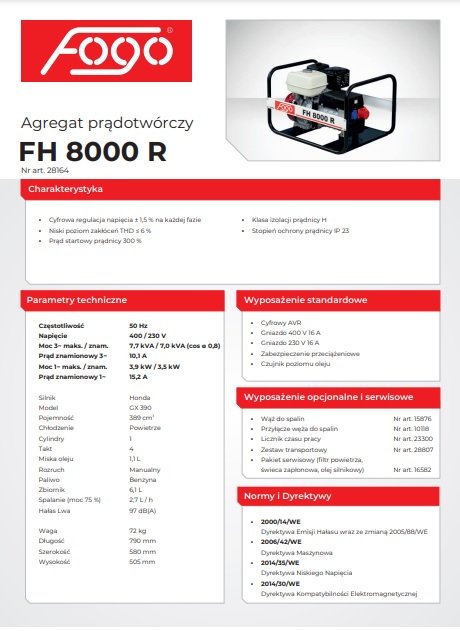 Agregat prądotwórczy FOGO FH 8000 R – 7,0 kW ciągłej / 7,5–8,0 kW maks., 230 V (AVR, Honda GX390)