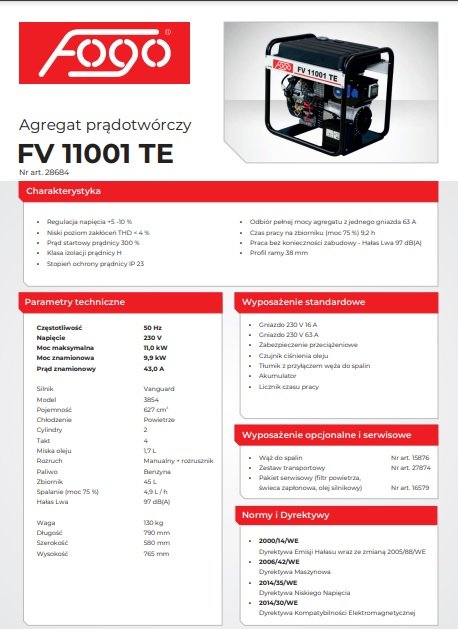 Agregat prądotwórczy FOGO FV 11001 TE – jednofazowy 230 V, 10,5 kW maks. / 9,5 kW ciągłej (Vanguard, rozruch elektryczny)