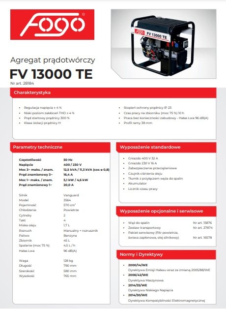 Agregat prądotwórczy FOGO FV 13000 TE – trójfazowy 400/230 V, 12,5 kVA (Vanguard, CVR, rozruch elektryczny)