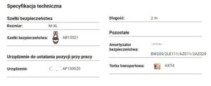 • szelki bezpieczeństwa P-51EmX z przednim i tylnym punktem zaczepowym, rozmiar M-XL lub XXL• amoryzator bezpieczeństwa ABM z podwójną elastyczną linką bezpieczeństwa 2 LE 111 z zatrzaśnikami AZ 011 i 2 x AZ 029• urządzenie do nadawania pozycji przy pracy PROT 3 o dł. 2 m z zatrzaśnikami AZ 011 i AZ 002• torba transportowa, wymiary 45 x 38 x 10 cm