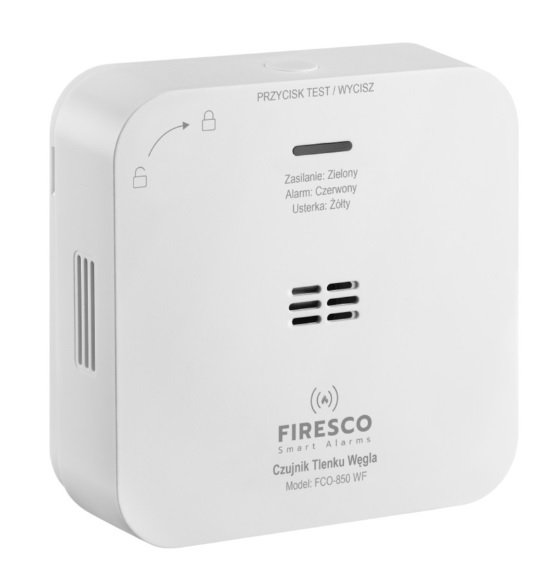 Czujnik tlenku węgla Firesco FCO-850 WF bazujący na sensorze elektrochemicznym o dużej dokładności i trwałości 10 lat. Posiada przycisk Test / Wycisz umożliwiający sprawdzenie działania urządzenia oraz wyciszenie fałszywych alarmów.