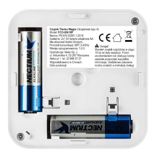 FCO-850 WF jest zasilany z 2 x 1.5V baterii alkalicznych, typu AA, dzięki czemu zapewnia ochronę również w przypadku zaniku napięcia zasilania w sieci. Po 10 latach od aktywacji zasilania czujnik przypomni o konieczności wymiany urządzenia.
