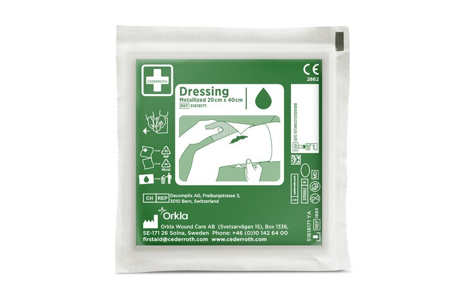 Kompres metalizowany z siatką Cederroth REF 1893 to zestaw zawierający duży sterylny opatrunek powierzchniowo metalizowany oraz elastyczną siatkę w kształcie rękawa z materiału nie zawierającego lateksu. Siatka skutecznie utrzymuje opatrunek w prawidłowym miejscu na głowie i kończynach. Metalizacja warstwą aluminium obu stron kompresu zapobiega przywieraniu do rany.Opatrunek przeznaczony jest do stosowania jako bariera mechaniczna i do absorpcji wydzielin z dużych ran na głowie i innych częściach ciała, na przykład na nogach.