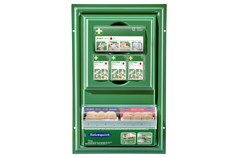 - 1 szt. – Automat Cederroth Salvequick Dispenser REF 490700 zawiera: 1 szt. – Plastry opatrunkowe tekstylne Salvequick Cederroth REF 6444 oraz 1 szt. – Plastry opatrunkowe plastikowe Salvequick Cederroth REF 6036,
