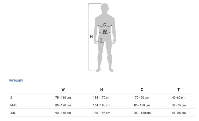 - Wymiary dopasowania – W: 100–130 cm; H: 180–195 cm; C: 90–140 cm; T: 60–85 c