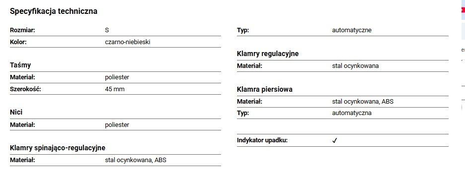 Klamry regulacyjne stalowe i klamra piersiowa automatyczna – zapewniają stabilne trzymanie i bezpieczne regulacje, co jest istotne przy pracy w rękawicach lub w warunkach utrudnionego dostępu.