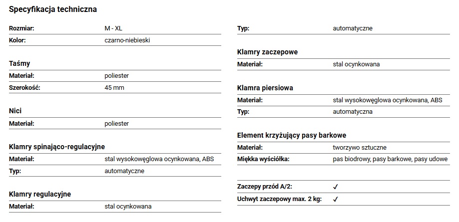 - Wygoda użytkowania — miękka wyściółka na pasie biodrowym, barkowym i udowym; automatyczne klamry i szerokie taśmy (45 mm) z regulacją umożliwiają szybkie zakładanie i wygodne dopasowanie