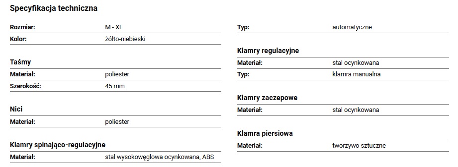 - Taśmy i nici z poliestru, szerokość taśm: 45 mm — materiał trwały, odporny na przetarcia, stabilny, dobrze wykończony — dobra równowaga między wytrzymałością a wagą.