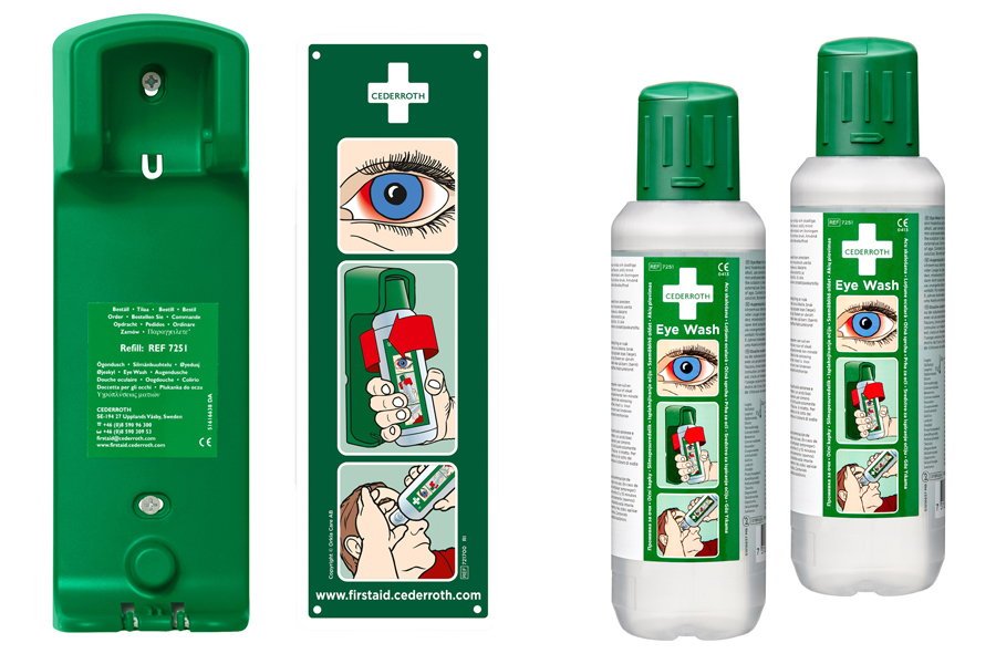 Płuczka od oczu płukanka w dwupaku Cederroth REF 725200 + Uchwyt ścienny REF 7200 to idealne rozwiązanie wszędzie tam, gdzie może dojść do zaprószenia lub ochlapania oczu niebezpiecznymi substancjami. Płukanki do oczu zaleca się montować w laboratoriach, magazynach chemicznych, zakładach przemysłowych również przy oczomyjkach, które są zasilane bieżącą wodą.