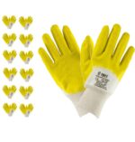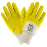 Rękawice URGENT 1011 to rękawice ochronne wykonane z miękkiej dzianiny bawełnianej, które są pokryte do połowy żółtą gumą o porowatej strukturze.