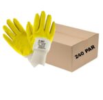 Rękawice URGENT 1011 to rękawice ochronne wykonane z miękkiej dzianiny bawełnianej, które są pokryte do połowy żółtą gumą o porowatej strukturze.