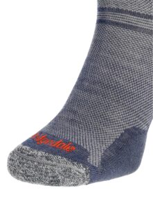 Skarpety w góry Bridgedale Hike z serii Ultra Light Merino Performance to najcieńsza opcja – nie pozbawiona amortyzacji! Ultracienka przędza sprawia, że stopa nie przegrzewa się i jest bardzo dobrze wentylowana. Nie chodzi tu jednak tylko o odpowiednio dobrany surowiec, lecz również o umiejętne jego rozłożenie na całej powierzchni skarpet. W miejscach gdzie na stopę działa największy ucisk, tarcie i uderzenia wciąż znajdziesz tu znacznie gęstszy i puszysty splot. Podwójne “pętelki w pętelkach” czyli T2 Anti-Shock Cushioning zapewniają puszystkość tam gdzie tego potrzeba i amortyzację każdego stawianego kroku. Rezultatem są cienkie skarpety w góry na lato, oferujące doskonały komfort wędrówki. Z jednej strony (dosłownie i w przenośni) mamy więc super cienką skarpetę termoaktywną, o strukturze siateczki rozciągniętej wokół całego śródstopia i na obwodzie górnego mankietu, z drugiej zaś, dobrze amortyzowane punkty na podeszwie – na pięcie i tuż pod palcami. Ponadto, płaskie łączenie przy palcach nie powoduje ucisku czy nieprzyjemnego ocierania, a miękki podwójny i bezuciskowy ściągacz utrzymuje skarpetę na miejscu w czasie wielogodzinnego marszu, zapobiegając zwijaniu i ocieraniu.