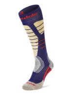 Skarpety narciarskie Bridgedale Ski Easy On Merino P nadają się zarówno do aktywności narciarskich jak i skituru. Zostały tak skonstruowane, aby zapewnić izolację termiczną, odpowiednią wytrzymałość, jak i komfort podczas intensywniejszego wysiłku. Skarpety posiadają charakterystyczną budowę, opartą na panelach o różnej grubości i właściwościach. Na palcach znajdziemy więc grubszy, doskonale izolujący materiał, aby najmocniej narażona na marznięcie część stopy była jak najlepiej chroniona. W części skarpet zastosowany został także materiał charakteryzujący się znacznie zmniejszonym tarciem, dzięki czemu zakładanie butów narciarskich nigdy nie było prostsze. U góry model został wykończony elastycznym pasem, który nie ogranicza przepływu krwi, ale zapobiega niepożądanemu podwijaniu się skarpet.