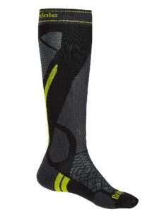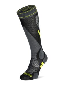 Skarpety skiturowe Bridgedale Ski Lightweight Merino P – black/lime – to wyjątkowo udany wybór, kiedy liczy się nie tylko wygoda wokół stóp, ale także zapewnienie odpowiedniego transportu wilgoci. Dzięki umieszczeniu stref cechujących się ponadprzeciętną wentylacją po bokach i na podbiciu, można być pewnym, że stopa pozostanie komfortowo sucha. Cienka konstrukcja modelu zapewnia natomiast maksymalne wyczucie nart, które jest kluczowym elementem podczas wypadu skiturowego.