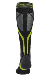 Równie istotne jak odpowiednia konstrukcja są użyte do produkcji skarpet narciarskich materiały. Używana przez firmę Bridgedale wysokiej klasy wełna Merino utrzymuje optymalny komfort termiczny, dostosowany do intensywności wysiłku fizycznego oraz warunków atmosferycznych. Polipropylenowe włókna Endurofil™ nadają skarpetom jeszcze lepszych właściwości termicznych, a także zdecydowanie poprawiają odprowadzanie wilgoci. Użycie w przedniej części skarpety, na goleni, włókien Tactel pozwoliło zmniejszyć powstające tam tarcie. Dzięki temu, sprawniej wsuwają się w botek narciarskiego/ skiturowego buta. Dodatek elastycznych włókien Lycra® jest gwarancją dobrego dopasowania do stopy i odporności na odkształcenia.