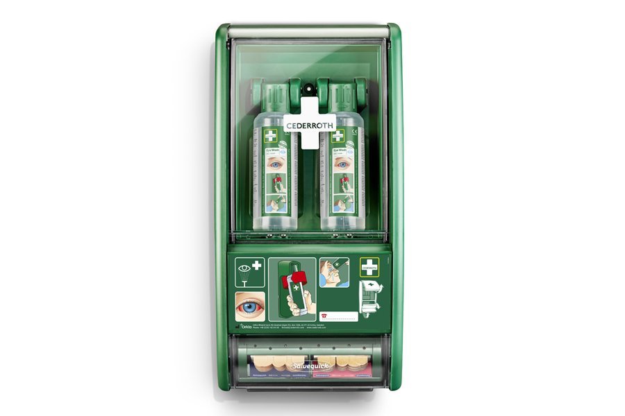 ✅Zestaw do płukania oczu Cederroth Eye Wash Station REF 721500 zawiera dwie butelki płukanki do oczu zamknięte pod przejrzystą pokrywą z uszczelką w specjalnie zaprojektowanej solidnej szafce, którą wiesza się na ścianie.